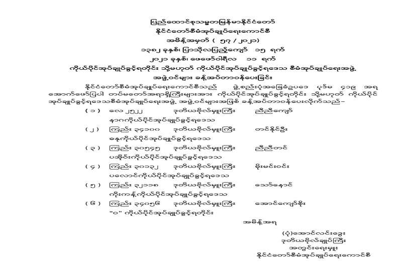 နိုင်ငံတော်စီမံအုပ်ချုပ်ရေးကောင်စီသည် ဖွဲ့စည်းပုံအခြေခံဥပဒေ ပုဒ်မ ၄၁၉ အရ အောက်ဖော်ပြပါ တပ်မတော်အရာရှိကြီးများအား ကိုယ်ပိုင်အုပ်ချုပ်ခွင့်ရတိုင်း သို့မဟုတ် ကိုယ်ပိုင် အုပ်ချုပ်ခွင့်ရဒေသစီမံအုပ်ချုပ်ရေးအဖွဲ့ အဖွဲ့ဝင်များအဖြစ် ခန့်အပ်တာဝန်ပေးလိုက်သည်-