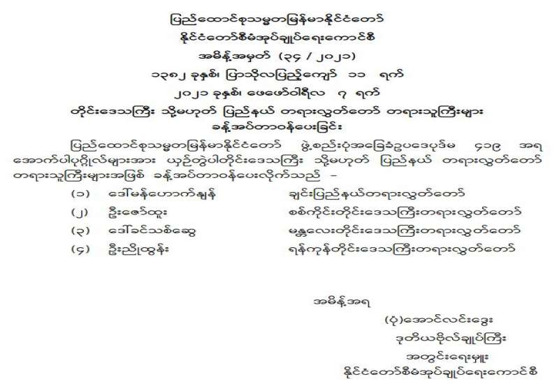 ပြည်ထောင်စုသမ္မတမြန်မာနိုင်ငံတော် ယာယီသမ္မတသည် နိုင်ငံတော်အတွင်း မူလ အခြေအနေသို့ အမြန်ပြန်လည် ရောက်ရှိစေခြင်းငှာ လိုအပ်သည့်အရေးယူဆောင်ရွက်မှုများ ပြုနိုင်ရန် ဖွဲ့စည်းပုံအခြေခံဥပဒေ ပုဒ်မ ၄၁၇ အရ အရေးပေါ်အခြေအနေကြေညာ၍ ဖွဲ့စည်းပုံအခြေခံဥပဒေ ပုဒ်မ ၄၁၈ အရ တပ်မတော်ကာကွယ်ရေးဦးစီးချုပ်အား နိုင်ငံတော်၏ ဥပဒေပြုရေး၊ အုပ်ချုပ်ရေးနှင့် တရားစီရင်ရေးအာဏာများကို လွှဲပြောင်းပေးခဲ့သည့် ၂၀၂၁ ခုနှစ်၊ ဖေဖော်ဝါရီလ ၁ ရက်နေ့မှစ၍ လွှတ်တော်အားလုံးနှင့် ဦးစီးအဖွဲ့များ၏ ဥပဒေပြုရေးဆိုင်ရာလုပ်ငန်းများ ရပ်ဆိုင်းသွားပြီး ဖြစ်ပါ သည်။