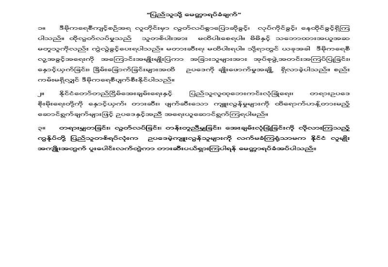 ၁။ ဒီမိုကရေစီကျင့်စဉ်အရ လူတိုင်းမှာ လွတ်လပ်စွာပြောဆိုခွင့်၊ လုပ်ကိုင်ခွင့်၊ နေထိုင်ခွင့်ရှိကြ ပါသည်။ ထိုလွတ်လပ်မှုသည် သူတစ်ပါးအား မထိပါးစေရပါ။ မိမိနှင့် သဘောထားအယူအဆ မတူသူကိုလည်း ကွဲလွဲခွင့်ပေးရပါသည်။ မတားဆီးရ၊ မထိပါးရပါ။ သို့ရာတွင် ယခုအခါ ဒီမိုကရေစီ လူ့အခွင့်အရေးကို အကြောင်းအမျိုးမျိုးပြကာ အခြားသူများအား အုပ်စုဖွဲ့အတင်းအကြပ်ပြုခြင်း၊ နှောင့်ယှက်ခြင်း၊ ခြိမ်းခြောက်ခြင်းများအထိ ဉပဒေကို ချိုးဖောက်မှုအချို့ ရှိလာခဲ့ပါသည်။ စည်း ကမ်းမရှိလျှင် ဒီမိုကရေစီပျက်စီးနိုင်ပါသည်။