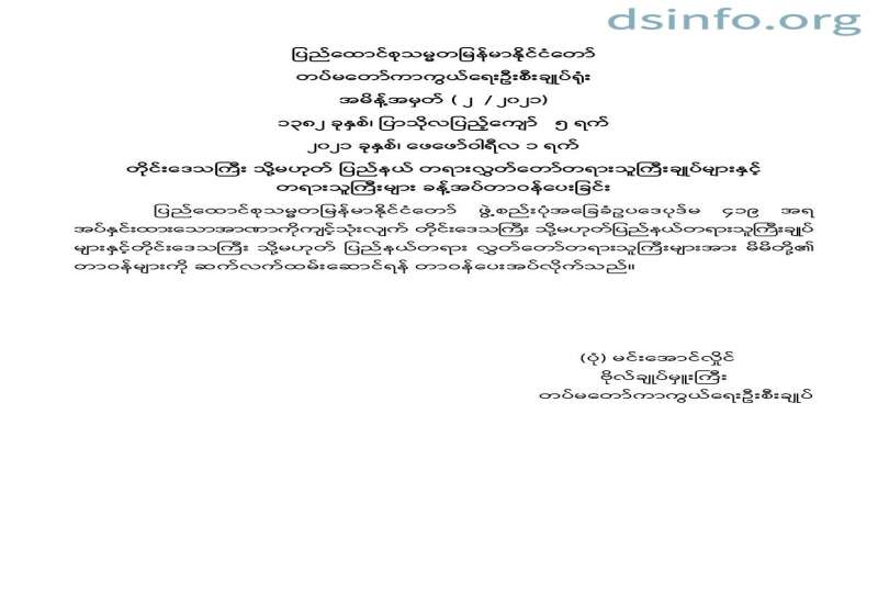 ပြည်ထောင်စုသမ္မတမြန်မာနိုင်ငံတော် တပ်မတော်ကာကွယ်ရေးဦးစီးချုပ်ရုံး အမိန့်အမှတ်(၄/၂၀၂၁) ၁၃၈၂ ခုနှစ်၊ ပြာသိုလပြည့်ကျော် ၅ ရက် ၂၀၂၁ ခုနှစ် ဖေဖော်ဝါရီလ ၁ ရက် မြန်မာနိုင်ငံအမျိုးသားလူ့အခွင့်အရေးကော်မရှင်ဥက္ကဋ္ဌ၊ဒုတိယဥက္ကဋ္ဌနှင့်အဖွဲ့ဝင်များ ခန့်အပ်တာဝန်ပေးခြင်း