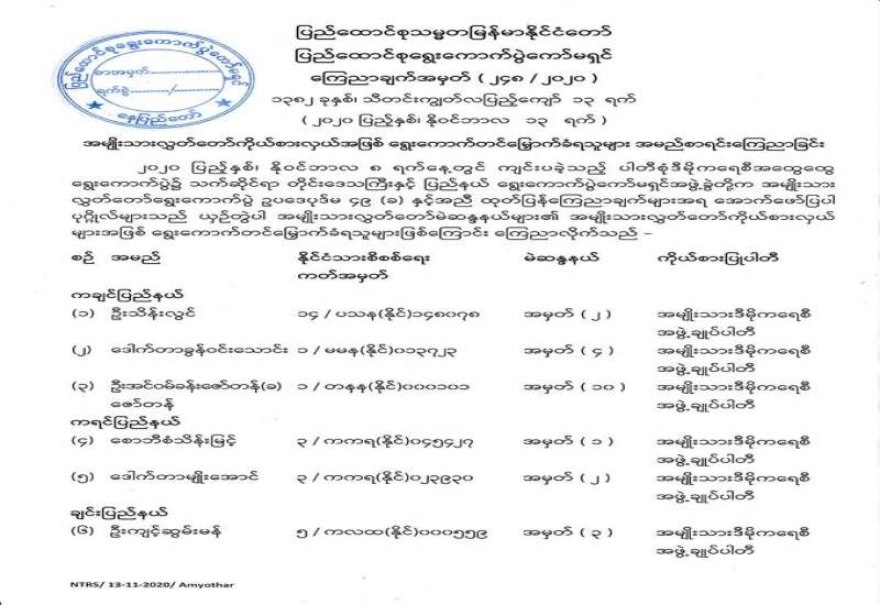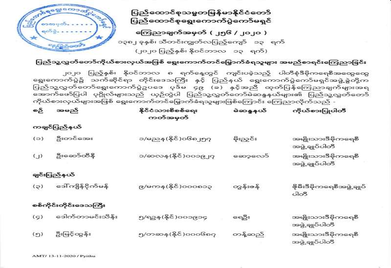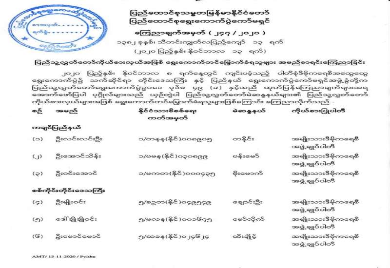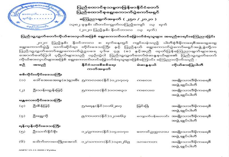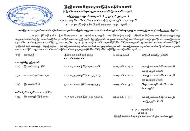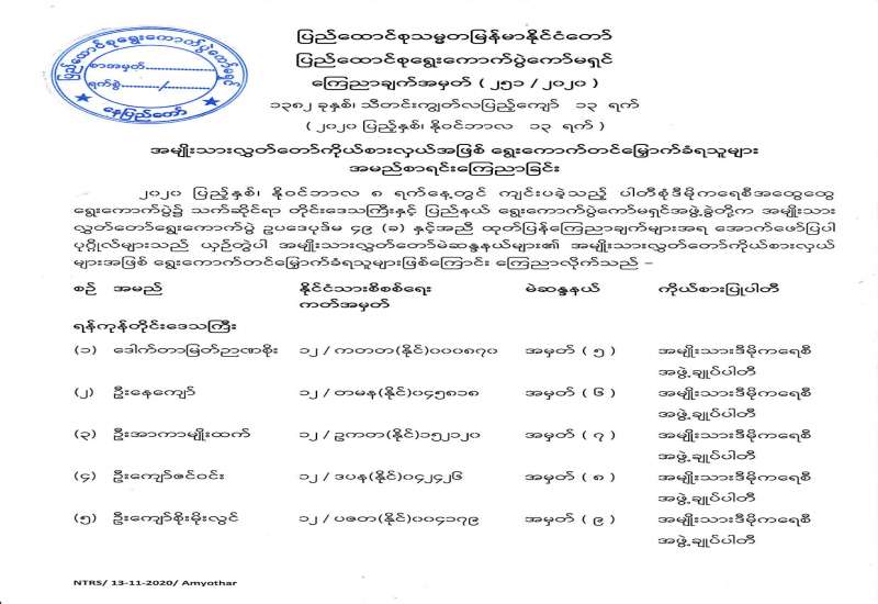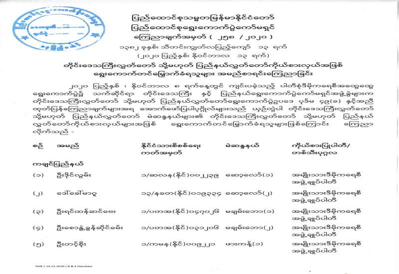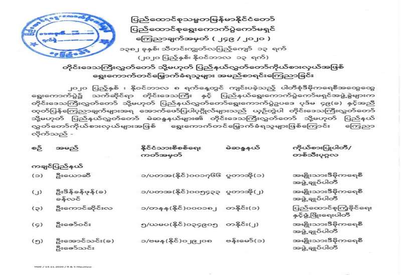 ၂၀၂၀ ပြည့်နှစ် ပါတီစုံဒီမိုကရေစီအထွေထွေရွေးကောက်ပွဲတွင် ရွေးကောက်တင်မြှောက် ပြီးဖြစ်သည့် လွှတ်တော်ကိုယ်စားလှယ်စာရင်းချုပ် ထုတ်ပြန်ကြေညာခြင်း