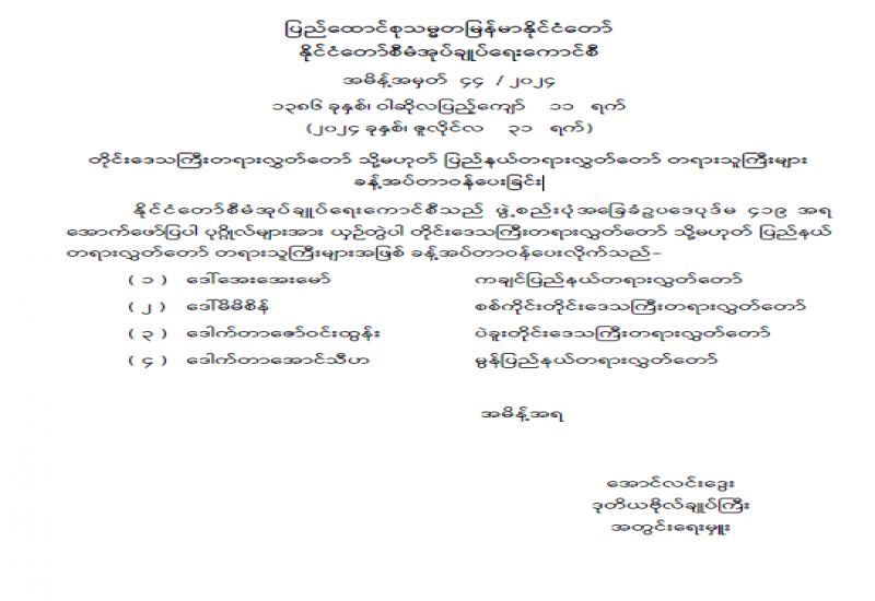 ပြည်ထောင်စုသမ္မတမြန်မာနိုင်ငံတော်အစိုးရသည် နိုင်ငံတော်နှင့် ပြည်သူများ၏ အကျိုးစီးပွားကို အစဉ်အလေးထား စီမံဆောင်ရွက်လျက်ရှိရာတွင် နိုင်ငံ့ဝန်ထမ်းများသည် အဓိကအခန်းကဏ္ဍမှ ပါဝင်ဆောင်ရွက်လျက်ရှိပါသည်။
