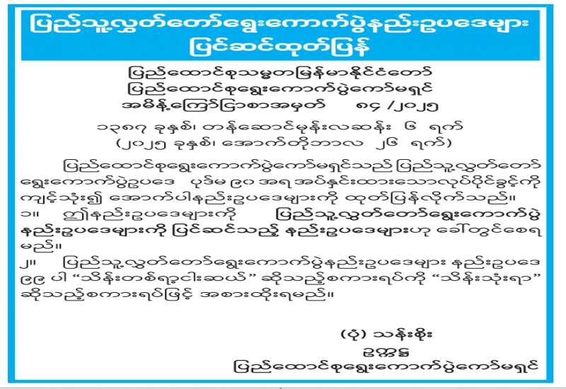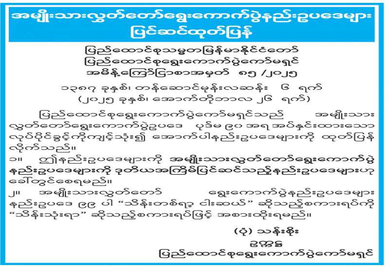 ၁။ ၂၀၂၅ ခုနှစ် ဒီဇင်ဘာလတွင် စတင်ကျင်းပမည့် ပါတီစုံဒီမိုကရေစီအထွေထွေရွေးကောက်ပွဲတွင် ပါဝင်ယှဉ်ပြိုင်ကြမည့် လွှတ်တော်ကိုယ်စားလှယ်လောင်းများသည် သက်ဆိုင်ရာကော်မရှင်အဖွဲ့ခွဲများတွင် ၈ - ၉ - ၂၀၂၅ ရက်နေ့မှ ၂၂ - ၉ - ၂၀၂၅ ရက်နေ့အထိ အမည်စာရင်းတင်သွင်းလွှာများကို တင်သွင်း ခဲ့ကြပြီးဖြစ်ပါသည်။