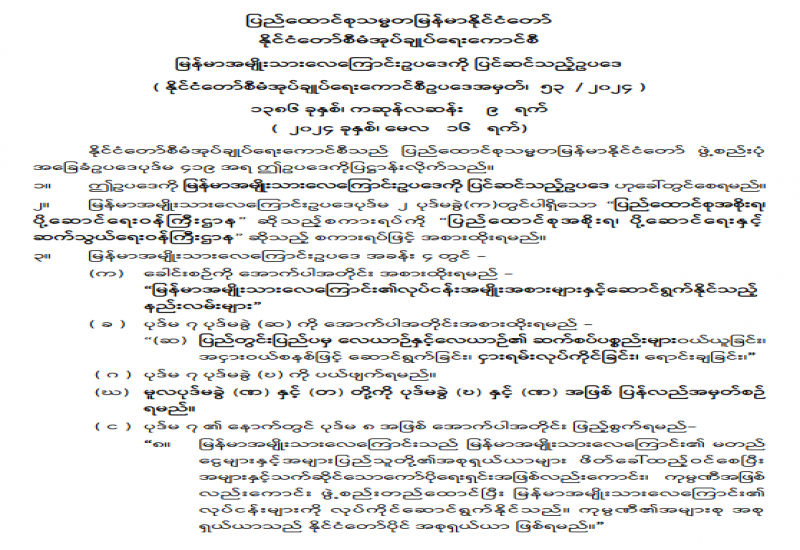 ၂၀၁၄ ခုနှစ်၊ ပုံနှိပ်ခြင်းနှင့် ထုတ်ဝေခြင်းလုပ်ငန်းဥပဒေ၊ နည်းဥပဒေများအရ ထုတ်ဝေသူများသည် မိမိတို့ထုတ်ဝေသည့် စာအုပ်စာစောင် ၅ အုပ် သို့မဟုတ် ၅ စောင်ကို ပြန်ကြားရေးဝန်ကြီးဌာနသို့ အဖိုးအခလွတ်ပေးအပ်ရမည်ဖြစ်ပါသည်။ ပြန်ကြားရေးဝန်ကြီးဌာနသည် အဆိုပါစာအုပ်စာစောင်များကို မူပိုင်ခွင့်နှင့် စာအုပ်စာရင်း ၂ အုပ်၊ အမျိုးသားစာပေဆု စိစစ်ရွေးချယ်ရေးကော်မတီသို့ ၂ အုပ်နှင့် အမျိုးသားမှတ်တမ်းများ မော်ကွန်းတိုက်ဦးစီးဌာနသို့ ၁ အုပ် ပေးပို့လျက်ရှိပါသည်။
