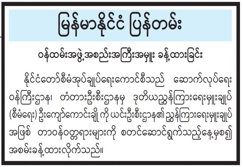 ၁။ ပြည်ထောင်စုသမ္မတမြန်မာနိုင်ငံတော်တွင် နိုင်ငံတော်အား ဆန့်ကျင်သော လက်နက်ကိုင်တိုက်ခိုက်မှုများသည် လွတ်လပ်ရေးရပြီးချိန်မှစ၍ ယနေ့တိုင်ဖြစ်ပွားလျက်ရှိပါသည်။ အဆိုပါ ဖြစ်စဉ်များကြောင့် အပြစ်မဲ့ပြည်သူများ၏ အသက်အိုးအိမ်စည်းစိမ်များစွာ ထိခိုက်ဆုံးရှုံးလျက်ရှိနေပါသည်။ ထို့ပြင် အများပြည်သူဆိုင်ရာ အခြေခံအဆောက်အဦများဖြစ်သည့် လမ်းတံတားများ၊ တာဝါတိုင်များ၊ လျှပ်စစ်ဓာတ်အားခွဲရုံများ၊ မီးရထားလမ်းများ၊ ဆေးရုံများ၊ စာသင်ကျောင်းများ၊ ဘာသာရေး အဆောက်အဦများလည်း ပျက်စီးဆုံးရှုံးလျက်ရှိပါသည်။