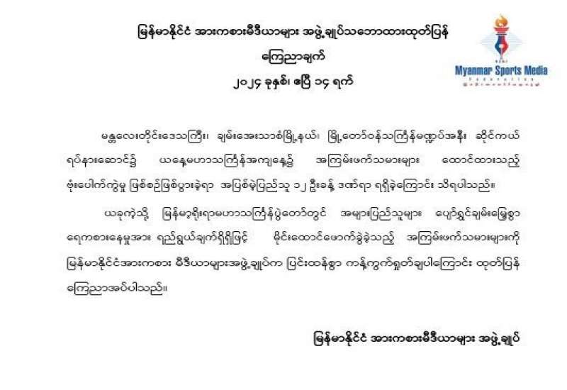 မြန်မာနိုင်ငံ အားကစားမီဒီယာများအဖွဲ့ချုပ် သဘောထားထုတ်ပြန်ကြေညာချက်