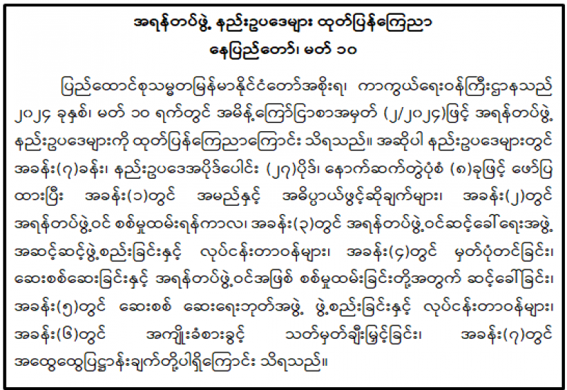 ပြည်ထောင်စုသမ္မတမြန်မာနိုင်ငံတော်အစိုးရ ကာကွယ်ရေးဝန်ကြီးဌာနသည် ၂၀၂၄ ခုနှစ် မတ် ၁ဝ ရက်တွင် အမိန့်ကြော်ငြာစာအမှတ် (၂/၂၀၂၄) ဖြင့် အရန်တပ်ဖွဲ့နည်းဥပဒေများကို ထုတ်ပြန်ကြေညာကြောင်း သိရသည်။