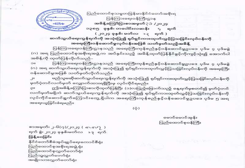 ၁။ အကောက်ခွန်ဦးစီးဌာနသည် ရန်ကုန်ဧရိယာ၊ မြဝတီနယ်စပ်ဒေသ၊ မူဆယ်နယ်စပ်ဒေသနှင့် ချင်းရွှေဟော်နယ်စပ်ဒေသတို့တွင် မြန်မာအလိုအလျောက် ကုန်စည်ရှင်းလင်းရေးစနစ်(Myanmar Automated Cargo Clearance System)ကို အသုံးပြုလျက်ရှိပြီး ယခုအခါ တိုးချဲ့ဒေသအဖြစ် တာချီလိတ်နယ်စပ်ဒေသတွင် ၂၀၂၄ ခုနှစ်၊ မတ်လ ၂၂ ရက်နေ့မှစတင်၍ အသုံးပြုသွားမည်ဖြစ်ပါသည်။