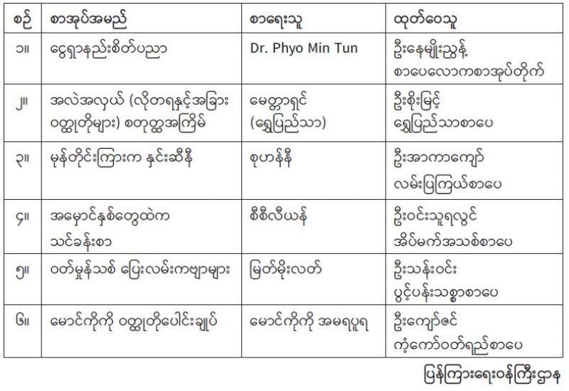 ၂၀၁၄ ခုနှစ် ပုံနှိပ်ခြင်းနှင့် ထုတ်ဝေခြင်းလုပ်ငန်း ဥပဒေ၊ နည်းဥပဒေများအရ ထုတ်ဝေသူများသည် မိမိတို့ထုတ်ဝေသည့် စာအုပ်စာစောင်ငါးအုပ် သို့မဟုတ် ငါးစောင်ကို ပြန်ကြားရေးဝန်ကြီးဌာနသို့ အဖိုးအခလွတ်ပေးအပ်ရမည် ဖြစ်ပါသည်။