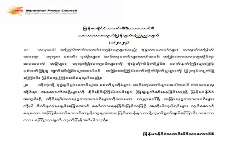 ပြန်ကြားရေးဝန်ကြီးဌာနအနေဖြင့် ပုံနှိပ်ခြင်းနှင့်ထုတ်ဝေခြင်းလုပ်ငန်းနည်းဥပဒေထွက်ရှိသည့် ၁၀-၁၀-၂၀၁၄ ရက်နေ့မှစ၍ ပုံနှိပ်ခြင်း၊ ထုတ်ဝေခြင်းနှင့် သတင်းအေဂျင်စီလုပ်ငန်း အသိအမှတ်ပြုလက်မှတ်များအား ငါးနှစ်သက်တမ်း ခွင့်ပြုပေးခဲ့ပါသည်။