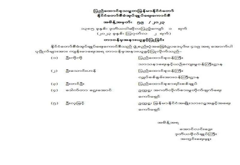 ပြည်ထောင်စုသမ္မတမြန်မာနိုင်ငံတော် နိုင်ငံတော်စီမံအုပ်ချုပ်ရေးကောင်စီ အမိန့်အမှတ်၊ ၆၂ / ၂၀၂၃ ၁၃၈၅ ခုနှစ်၊ ဒုတိယဝါဆိုလပြည့်ကျော် ၂ ရက် (၂၀၂၃ ခုနှစ်၊ ဩဂုတ်လ ၃ ရက်) ပြည်ထောင်စုတရားသူကြီးချုပ် ခန့်အပ်တာဝန်ပေးခြင်း