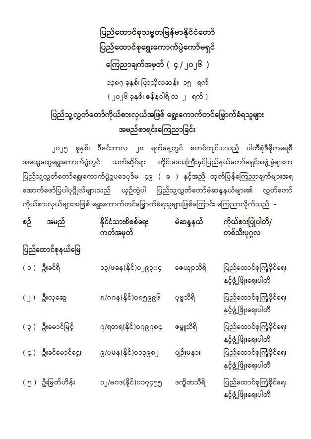 ပြည်သူ့လွှတ်တော်ကိုယ်စားလှယ်အဖြစ် ရွေးကောက်တင်မြှောက်ခံရသူများ အမည်စာရင်း ကြေညာခြင်း