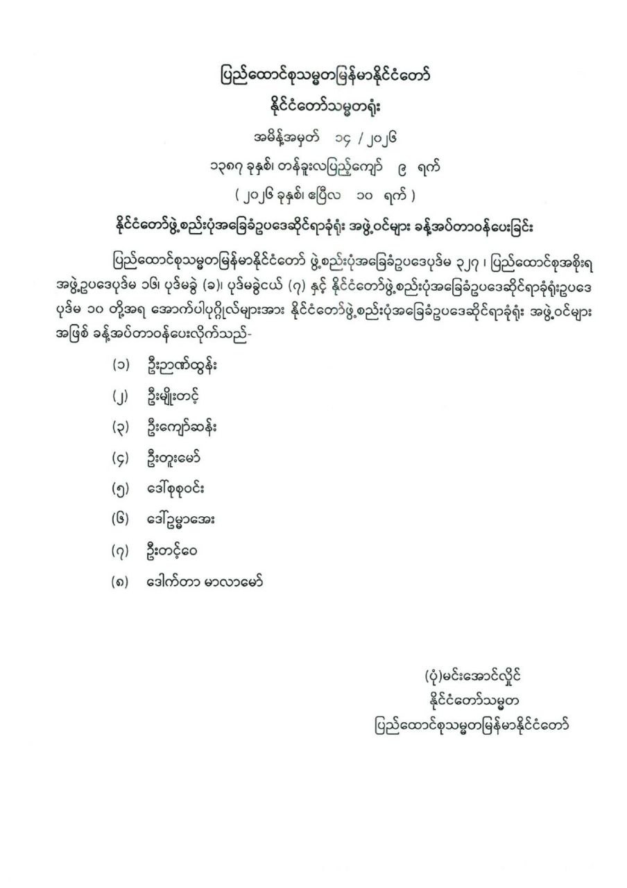 နိုင်ငံတော်ဖွဲ့စည်းပုံအခြေခံဥပဒေဆိုင်ရာခုံရုံး အဖွဲ့ဝင်များ ခန့်အပ်တာဝန်ပေးခြင်း