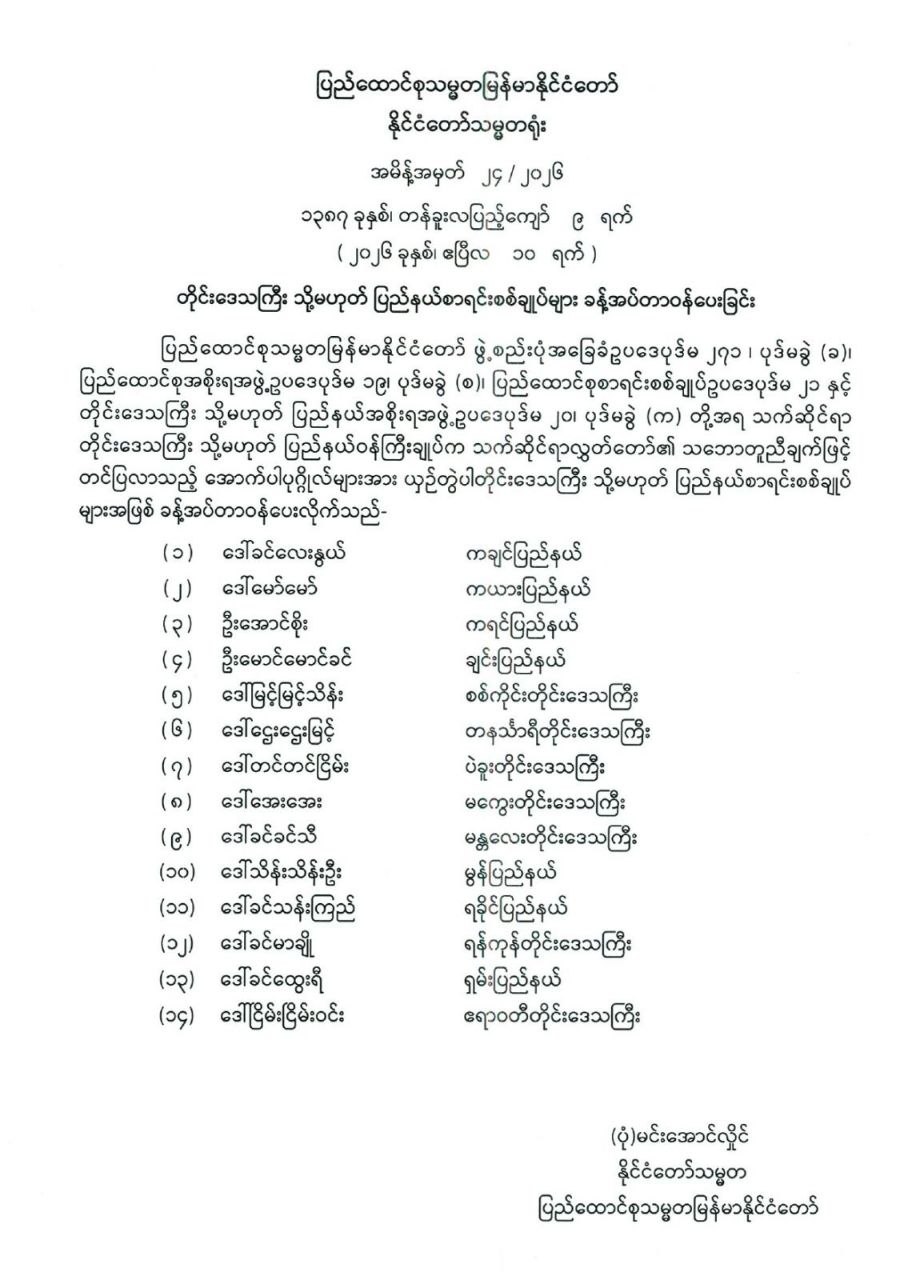 တိုင်းဒေသကြီး သို့မဟုတ် ပြည်နယ်စာရင်းစစ်ချုပ်များ ခန့်အပ်တာဝန်ပေးခြင်း