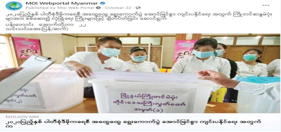 ရွေးကောက်ပွဲ ကျင်းပသည့်နေ့ရက်တွင် MOI Website၊ MOI Facebook များ၌ နိုင်ငံတစ်ဝန်း ရွေးကောက်ပွဲများ ကျင်းပနေမှု သတင်းများ၊ ပြည်သူများ ဆန္ဒမဲလာရောက်ပေးနေသည့် သတင်းများ၊ MRTV နှင့် သတင်းစာများတွင် ဖော်ပြသည့်သတင်းများကို ထပ်ဆင့်မျှဝေသည့် သတင်းများ၊ ပြည်ထောင်စု ရွေးကောက်ပွဲကော်မရှင်မှ ထုတ်ပြန်ကြေညာချက်များအပါအဝင် စုစုပေါင်း သတင်း ၄၁၇ ပုဒ်ကို ဖော်ပြပေးခဲ့သည်။