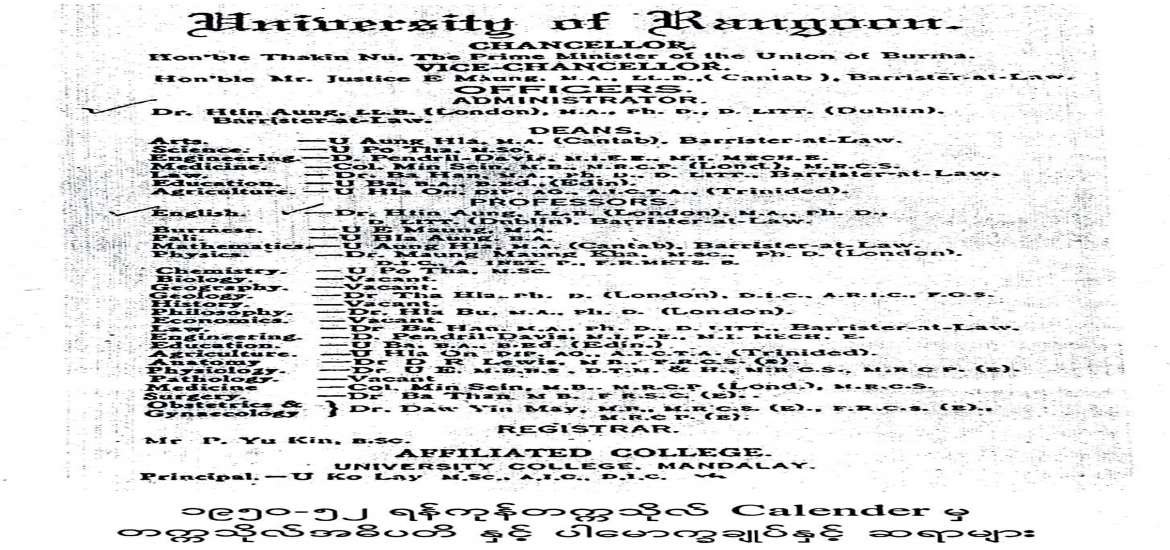 (*၁ University of Rangoon Calendar for 1950-52, Calcutta Press, Rangoon. First Cover.)