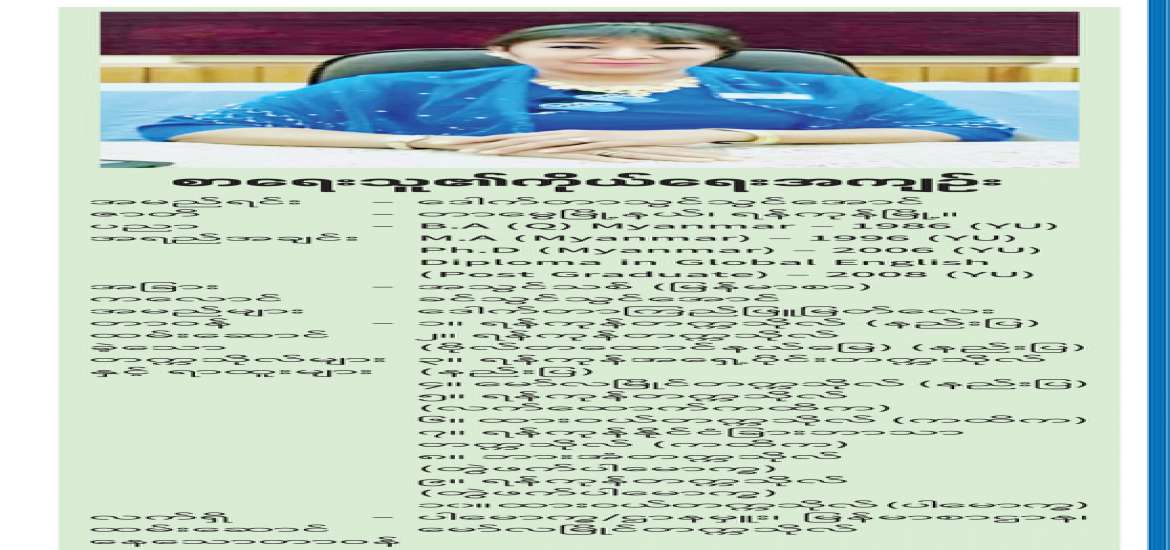 ရန်ကုန်တက္ကသိုလ်မှာ အမှုထမ်းရင်း နိုင်ငံ့သားကောင်း မြန်မာစာသားသမီးကောင်း၊ စိတ်ကောင်း၊ စေတနာကောင်းရှိသူတွေကို မွေးထုတ်ခဲ့သူ အဖြစ် ဂုဏ်ယူစွာ အမိရန်ကုန် တက္ကသိုလ် ကြီးကို ကျေးဇူးတင်နေ မိပါတယ်။ “စာပေမြင့်မှ လူမျိုးတင့်တယ်” ဆိုတဲ့ ဆိုရိုးအတိုင်း မြန်မာစာပေကို မြင့်မားအောင်၊ ကမ္ဘာ့အလယ်မှာ မြန်မာလူမျိုးရယ်လို့ ဂုဏ်တင့်တယ်အောင် ပြုစုပျိုးထောင် ပေးခဲ့တဲ့ ရန်ကုန်တက္ကသိုလ်ကြီးကို ဘယ်သောအခါမှ မမေ့နိုင်တော့ပါ။ ရန်ကုန်တက္ကသိုလ်ကြီးမှာ ရာထူးအဆက်ဆက် အလုပ်အကျွေးပြုစုရလို့ ဝမ်းသာကြည်နူး ခဲ့ရပါတယ်။ ပတ်ဝန်းကျင်ကောင်းဖြစ်တဲ့ ရန်ကုန် တက္ကသိုလ်ကြီးမှာ ကိုယ်ကျင့် သိက္ခာကောင်းတွေ၊ စိတ်ဓာတ်ကောင်းတွေ တည်တံ့ခိုင်မြဲစွာတည်ရှိဖို့၊ သင်ယူလေ့ကျင့် တတ်မြောက်အောင် ဆည်းပူးရင်း အနာဂတ်သာယာလှပဖို့ ဝန်းကျင်ကောင်းတွေ၊ တပည့်ကောင်းတွေ၊ လူ့စွမ်းအား အရင်းအမြစ်ကောင်းတွေ ပေါ်ထွက်လာအောင် ကြိုးပမ်းဆောင်ရွက်ခဲ့ပါတယ်။ ယခုလည်း ရောက်ရှိရာတက္ကသိုလ်မှာ ဝန်းကျင်ကောင်းတွေ သစ်လွင်ဖန်တီးရင်း အမိရန်ကုန် တက္ကသိုလ်ကြီးကို ဦးညွှတ်လိုက်ပါတယ်…။