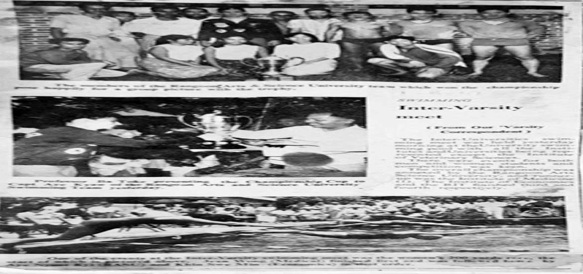 ရန်ကုန်တက္ကသိုလ်ကြီးဟာ ပညာရေးကို အဓိကအခြေပြုပြီး အမျိုးသားရေးနဲ့နိုင်ငံရေး လှုပ်ရှားမှုများ၊ စာပေနဲ့ အနုပညာ လှုပ်ရှားမှုများနဲ့ အတူ အားကစားလှုပ်ရှားမှုများဟာလည်း အရေးပါတဲ့နေရာမှာ ပါဝင်ခဲ့ပါတယ်။ အားကစားလှုပ်ရှားမှုတွေထဲမှ တက္ကသိုလ်ရေကူးပြိုင်ပွဲများ ဟာလည်း ကဏ္ဍတစ်ခုအဖြစ် ပါဝင်ခဲ့တာမို့ နှစ် (၁၀၀) ပြည့် ရန်ကုန်တက္ကသိုလ်ကို ဂုဏ်ပြုပြီး ဤဆောင်းပါးကို ရေးသားရခြင်း ဖြစ်ပါတယ်။