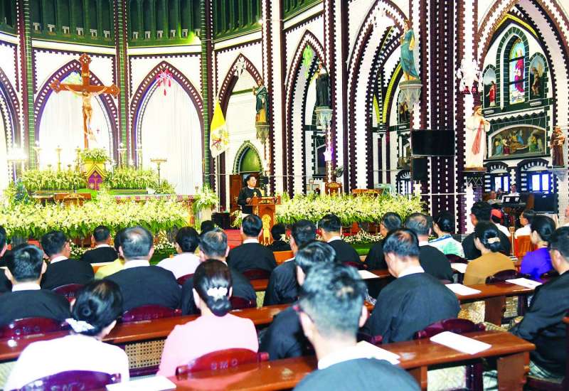မြန်မာနိုင်ငံခရစ်ယာန်အသင်းတော်ပေါင်းစုံ အဖွဲ့ချုပ်ကြီးများ ကြီးမှူးကျင်းပသည့် ခရစ်တော်မွေးနေ့ (ခရစ္စမတ်) ကျေးဇူးတော်ချီးမွမ်းခြင်းနှင့် မိတ်သဟာယညစာစားပွဲအခမ်းအနားကို ယနေ့ညနေပိုင်းတွင် ရန်ကုန်တိုင်းဒေသကြီး၊ ဗိုလ်တထောင်မြို့ နယ်ရှိ St. Mary’s Cathedral Church ၌ ကျင်းပပြုလုပ်ရာ နိုင်ငံတော်စီမံအုပ်ချုပ်ရေးကောင်စီဥက္ကဋ္ဌ နိုင်ငံတော်ဝန်ကြီးချုပ် ဗိုလ်ချုပ်မှူးကြီးမင်းအောင်လှိုင်တက်ရောက်ချီးမြှင့်သည်။