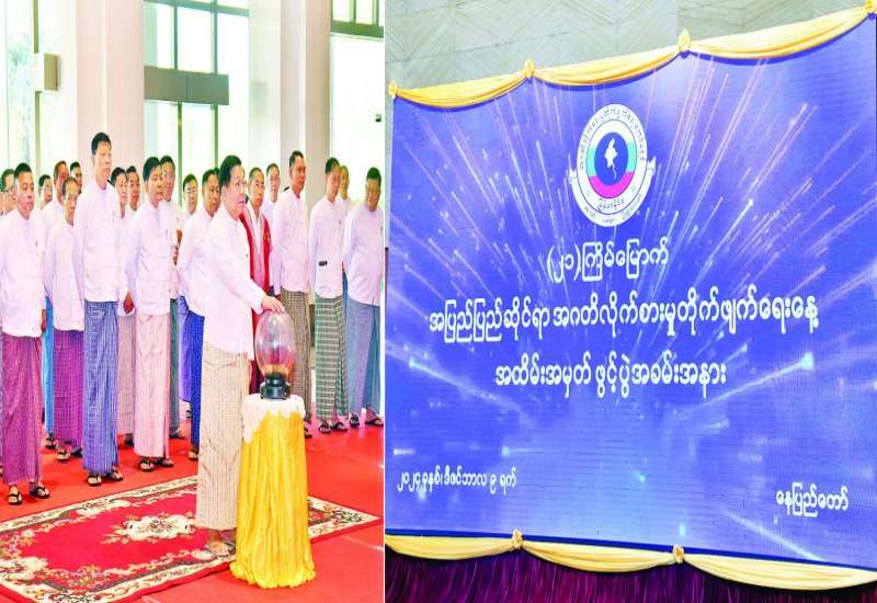 မြန်မာနိုင်ငံ “စီးပွားရေးပညာနှစ် (၁၀၀)” ရာပြည့်အထိမ်းအမှတ် အခမ်းအနားကို ယနေ့နံနက်ပိုင်းတွင် နေပြည်တော်ရှိ မြန်မာအပြည်ပြည်ဆိုင်ရာကွန်ဗင်းရှင်း ဗဟို ဌာန - ၂ ၌ ကျင်းပပြုလုပ်ရာ နိုင်ငံတော်စီမံအုပ်ချုပ်ရေးကောင်စီဥက္ကဋ္ဌ နိုင်ငံတော်ဝန်ကြီးချုပ် ဗိုလ်ချုပ်မှူးကြီး မင်းအောင်လှိုင် တက်ရောက်ချီးမြှင့်ပြီး အမှာစကားပြောကြားသည်။