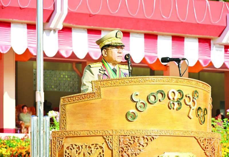 စစ်တက္ကသိုလ် ဗိုလ်လောင်းသင်တန်းအမှတ်စဉ်(၆၆) သင်တန်းဆင်းဂုဏ်ပြု စစ်ရေးပြအခမ်းအနားကို ယနေ့နံနက်ပိုင်းတွင် ပြင်ဦးလွင်မြို့၊ စစ်တက္ကသိုလ်စစ်ရေးပြကွင်း၌ ကျင်းပပြုလုပ်ရာ နိုင်ငံတော်စီမံအုပ်ချုပ်ရေးကောင်စီဥက္ကဋ္ဌ တပ်မတော်ကာကွယ်ရေးဦးစီးချုပ် ဗိုလ်ချုပ်မှူးကြီး သတိုးမဟာသရေစည်သူ သတိုးသီရိသုဓမ္မ မင်းအောင်လှိုင် တက်ရောက်မိန့်ခွန်း ပြောကြားသည်။