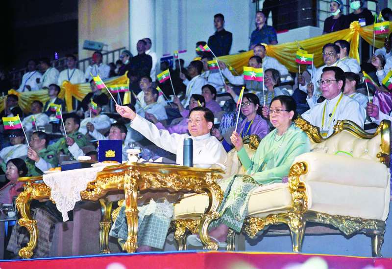 (၇၅) ကြိမ်မြောက် စိန်ရတုအမျိုးသားစာပေဆုအထိမ်းအမှတ် ၂၀၂၃ ခုနှစ်အတွက် အမျိုးသားစာပေတစ်သက်တာဆု၊ အမျိုးသားစာပေဆုနှင့် စာပေဗိမာန်စာမူဆုဆုနှင်းသဘင်အခမ်းအနားကို ယနေ့နံနက်ပိုင်းတွင် နေပြည်တော်ရှိ အပြည်ပြည်ဆိုင်ရာကွန်ဗင်းရှင်းဗဟိုဌာန - ၁ ၌ ကျင်းပပြုလုပ်ရာ နိုင်ငံတော်စီမံအုပ်ချုပ်ရေးကောင်စီဥက္ကဋ္ဌ နိုင်ငံတော်ဝန်ကြီးချုပ် ဗိုလ်ချုပ်မှူးကြီး မင်းအောင်လှိုင်နှင့် ဇနီး ဒေါ်ကြူကြူလှတို့ တက်ရောက်၍ စာပေဆုများပေးအပ်ချီးမြှင့်သည်။