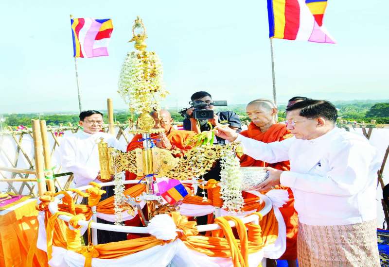 နေပြည်တော် ပျဉ်းမနားမြို့ ပါဠိတက္ကသိုလ် မင်္ဂလာဇေယျုံကျောင်းတိုက် ဝတ္ထုကံတော်အတွင်းရှိ မြို့တော်ထိပ်ပန်မင်္ဂလာစေတီတော် အထက်ဌာပနာတော်သွင်း၊ ရွှေထီးတော်တင်နှင့် ဗုဒ္ဓါဘိသေက အနေကဇာတင်မဟာမင်္ဂလာအခမ်းအနားကို ယနေ့နံနက်ပိုင်းတွင် ကျင်းပပြုလုပ်ရာ တိုင်းဩဝါဒါစရိယ၊ ပုဗ္ဗသီရိမြို့နယ် ဝဲကြီးစာသင်တိုက်ဆရာတော် အဘိဓဇမဟာရဋ္ဌဂုရု ဘဒ္ဒန္တအာဒိစ္စဝံသနှင့် ပါဠိတက္ကသိုလ် မင်္ဂလာဇေယျုံကျောင်းတိုက် ပဓာနနာယက အဂ္ဂမဟာပဏ္ဍိတ အဂ္ဂမဟာသဒ္ဓမ္မဇောတိကဓဇ ဘဒ္ဒန္တဝိမလဗုဒ္ဓိ အမှူးပြုသည့် ဆရာတော်၊ သံဃာတော် အရှင်သူမြတ်များ ကြွရောက်ချီးမြှင့်တော်မူကြသည်။
