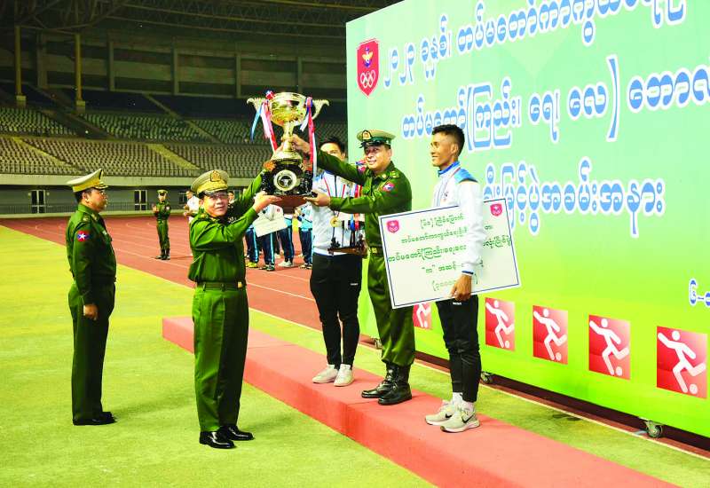 အကြိမ် (၆၀) မြောက် တပ်မတော်ကာကွယ်ရေးဦးစီး ချုပ်ဖလား တပ်မတော် (ကြည်း၊ ရေ၊ လေ) ဘောလုံးပြိုင်ပွဲ ဗိုလ်လုပွဲကို ယနေ့ညနေပိုင်းတွင် နေပြည်တော်ရှိ ဇေယျာသီရိ တပ်မတော်အားကစားကွင်း၌ ကျင်းပပြုလုပ်ရာ အရှေ့ပိုင်းတိုင်းစစ်ဌာနချုပ် ကိုယ်စားပြု ဘောလုံးအသင်းနှင့် ကာကွယ်ရေးဦးစီးချုပ်ရုံး (ကြည်း) စခန်းမှူးရုံး ကိုယ်စားပြုဘောလုံးအသင်းတို့ ယှဉ်ပြိုင်ကစားကြသည်။