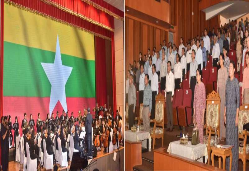 ပြန်ကြားရေးဝန်ကြီးဌာန၊ မြန်မာ့အသံနှင့်ရုပ်မြင်သံကြား၊ နိုင်ငံတော်သံစုံတီးဝိုင်းဖျော်ဖြေတင်ဆက်မှုကို ယနေ့မွန်းလွဲပိုင်းတွင် ရန်ကင်းမြို့နယ်၊ မြဝတီမီဒီယာစင်တာရှိ Theatre ၌ ပြုလုပ်ရာ နိုင်ငံတော်စီမံအုပ်ချုပ်ရေးကောင်စီဥက္ကဋ္ဌ နိုင်ငံတော်ဝန်ကြီးချုပ် ဗိုလ်ချုပ်မှူးကြီး မင်းအောင်လှိုင် တက်ရောက်ကြည့်ရှုအားပေးသည်။