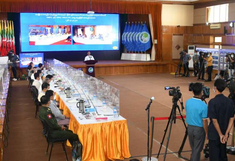 နိုင်ငံတော်စီမံအုပ်ချုပ်ရေးကောင်စီ၊ သတင်းထုတ်ပြန်ရေးအဖွဲ့၏ (၁၂)ကြိမ် မြောက် သတင်းစာ ရှင်းလင်းပွဲကို ယနေ့ နေ့လယ်ပိုင်းတွင် ပြန်ကြားရေးဝန်ကြီးဌာန၌ ကျင်းပပြုလုပ်ရာ နိုင်ငံတော် စီမံအုပ်ချုပ်ရေးကောင်စီ၊ သတင်းထုတ်ပြန်ရေး အဖွဲ့ခေါင်းဆောင် ဗိုလ်ချုပ် ဇော်မင်းထွန်း၊ ပြည်ထောင်စုရွေးကောက်ပွဲကော်မရှင် အဖွဲ့ဝင် ဦးခင်မောင်ဦး၊ ဌာနဆိုင်ရာများမှ ပြောရေး ဆိုခွင့်ရှိသူများနှင့် ဌာနဆိုင်ရာ သတင်းထုတ်ပြန်ရေးအဖွဲ့ ကိုယ်စားလှယ်များက သတင်းမီဒီယာ များ၏ သိရှိလို သည့် မေးမြန်း မှုများကို ပြန်လည်ဖြေကြားသည်။