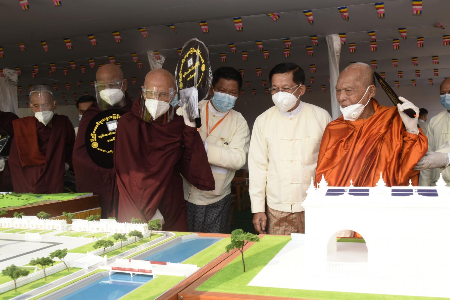 နေပြည်တော်၊ မတ် - ၂၅ ပြည်ထောင်စုနယ်မြေ၊ နေပြည်တော်၊ ဒက္ခိဏသီရိမြို့နယ်ရှိ ဗုဒ္ဓဥယျာဉ်တော်တွင် တည်ထားပူဇော်မည့် ဘူမိဖဿမုဒြာ ထိုင်တော်မူကျောက်ဆစ်ဗုဒ္ဓရုပ်ပွားတော်မြတ်ကြီး တည်ဆောက်ရေးလုပ်ငန်းဆိုင်ရာများအား နိုင်ငံတော်သံဃမဟာနာယကအဖွဲ့ ဆရာတော် ကြီးများထံသို့ တင်ပြလျှောက်ထားခြင်းနှင့် ဩဝါဒခံယူခြင်းအခမ်းအနားကို ယနေ့နံနက်ပိုင်း တွင် ရုပ်ပွားတော်မြတ်ကြီးတည်ထားကိုးကွယ်မည့် ဒက္ခိဏသီရိ မြို့နယ်ရှိ ဗုဒ္ဓဥယျာဉ်တော် မင်္ဂလာနေရာ၌ ကျင်းပပြုလုပ်သည်။ အခမ်းအနားသို့ နိုင်ငံတော်သံဃမဟာနာယကအဖွဲ့ဥက္ကဋ္ဌ၊ မန္တလေးမြို့၊ ဗန်းမော် ကျောင်းတိုက် ပဓာနနာယက၊ အဘိဓဇမဟာရဋ္ဌဂုရု၊ အဘိဓဇအဂ္ဂမဟာ သဒ္ဓမ္မဇောတိက ဒေါက်တာဘဒ္ဒန္တကုမာရာဘိဝံသ ဗန်းမော်ဆရာတော်ကြီး၊ နိုင်ငံတော် သံဃမဟာနာယကအဖွဲ့ အကျိုးတော်ဆောင်၊ သန်လျင်မြို့၊ မင်းကျောင်းပထမပြန် စာသင် တိုက် ပဓာနနာယက အဂ္ဂမဟာပဏ္ဍိတ၊ အဂ္ဂမဟာသဒ္ဓမဇောတိကဓဇ ဒေါက်တာ ဘဒ္ဒန္တစန္ဒိမာ ဘိဝံသနှင့် ဘွဲ့တံဆိပ်တော်ရဆရာတော်၊သံဃာတော်များ ကြွရောက်ချီးမြှင့်တော်မူကြပြီး နိုင်ငံတော်စီမံအုပ်ချုပ်ရေးကောင်စီဥက္ကဋ္ဌ တပ်မတော်ကာကွယ်ရေးဦးစီးချုပ် ဗိုလ်ချုပ်မှူးကြီး မင်းအောင်လှိုင်၊ ကောင်စီဒုတိယဥက္ကဋ္ဌ ဒုတိယတပ်မတော်ကာကွယ်ရေးဦးစီးချုပ် ကာကွယ်ရေး ဦးစီးချုပ်(ကြည်း) ဒုတိယဗိုလ်ချုပ်မှူးကြီး စိုးဝင်း၊ သာသနာရေးဝန်ကြီးဌာန ပြည်ထောင်စု ဝန်ကြီး ဦးကိုကို၊ နေပြည်တော်ကောင်စီဥက္ကဋ္ဌ ဒေါက်တာ မောင်မောင်နိုင်၊ ကာကွယ်ရေးဦးစီး ချုပ်ရုံးမှ တပ်မတော်အရာရှိကြီးများ၊ နေပြည်တော်တိုင်းစစ်ဌာနချုပ်တိုင်းမှူးနှင့် ဖိတ်ကြား ထားသည့် ဧည့်သည်တော်များ တက်ရောက်ကြည်ညိုကြသည်။ ဦးစွာ နမောတဿ သုံးကြိမ်ရွတ်ဆိုဘုရားကန်တော့၍ အခမ်းအနားအားဖွင့်လှစ်ပြီး ဦးဆောင်ဘုရားဒါယကာ နိုင်ငံတော်စီမံအုပ်ချုပ်ရေးကောင်စီဥက္ကဋ္ဌ တပ်မတော်ကာကွယ်ရေး ဦးစီးချုပ်က ဗုဒ္ဓရုပ်ပွားတော်မြတ်ကြီး တည်ဆောက်ပူဇော်ရေးနှင့် စပ်လျဉ်း၍ တင်ပြ လျှောက်ထားရာတွင် နေပြည်တော်၌ ဉာဏ်တော် ၈၁ ပေအမြင့်ရှိ စကျင်ဆင်းတုတော်ကြီးကို မြန်မာနိုင်ငံတွင် ထေရဝါဒဗုဒ္ဓသာသနာတော်ကြီး ခိုင်မာစွာထွန်းလင်းတောက်ပလျက်ရှိ သည်ကို ကမ္ဘာကိုပြသရန်၊ တိုင်းပြည်အေးချမ်းသာယာမှုရှိစေရန်၊ ရုပ်ပွာတော်မြတ် ကြီးအား ပြည်တွင်းပြည်ပ ဘုရားဖူးများ လာရောက်ခြင်းဖြင့် ဒေသတိုးတက်စည်ကားမှုဖြစ်စေရန်၊ နိုင်ငံတော်ဖွံ့ဖြိုးတိုးတက်မှုအထောက်အကူဖြစ်စေရန် စသည့် ရည်ရွယ်ချက် ၄ ရပ်ဖြင့် တည်ထားကိုးကွယ်ရန်လုပ်ဆောင်ခဲ့ခြင်းဖြစ်ပါကြောင်း၊ အဆိုပါဘူမိဖဿမုဒြာ ထိုင်တော်မူ ကျောက်ဆစ်ဗုဒ္ဓရုပ်ပွားတော်မြတ်ကြီးအဖြစ် ထုဆစ်ပူဇော်မည့် စကျင်