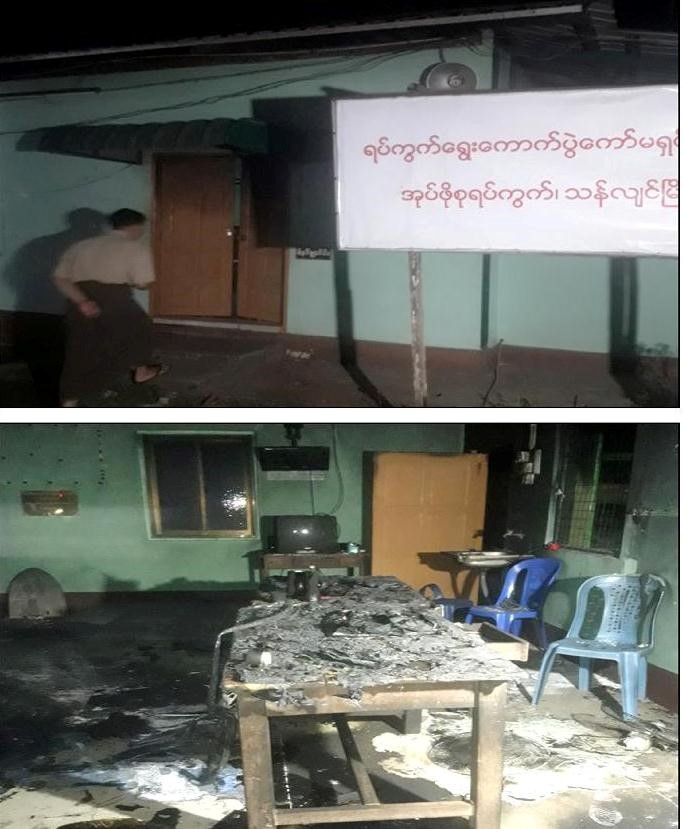 အလားတူ နံနက် ၅ နာရီခွဲအချိန်တွင် သန်လျင်မြို့နယ်၊ အမှုထမ်းရပ်ကွက်၊ ရပ်ကွက်စီမံအုပ် ချုပ်ရေးအဖွဲ့ရုံး မီးလောင်နေကြောင်းသတင်းအရ လုံခြုံရေးတပ်ဖွဲ့ဝင်များနှင့် မီးသတ်တပ်ဖွဲ့ဝင်များ က သွားရောက်မီးငြှိမ်းသတ်ခဲ့ရာ နံနက် ၅ နာရီ ၄၀ မိနစ်အချိန်တွင် မီးငြိမ်းသွားခဲ့ပြီး မီးလောင်မှု ကြောင့် ရုံးတွင်ချိတ်ဆွဲထားသော ဗီနိုင်း ၁ ခု မီးလောင်ပျက်စီးဆုံးရှုံးခဲ့ပြီး လုံခြုံရေးတပ်ဖွဲ့ဝင်များက မီးလောင်မှုနှင့်ပတ်သက်၍ စိစစ်ခဲ့ရာ အဆိုပါရုံးပတ်လည်တွင် အကြမ်းဖက်သူလူတစ်စုမှ ဒီဇယ်ဆီ များပတ်ဖြန်းထားပြီး ရုံးဝင်းအတွင်းရှိ အမှိုက်ပုံများအား စုပုံမီးရှို့ထားခဲ့ခြင်းဖြစ်ကြောင်း သိရသည်။