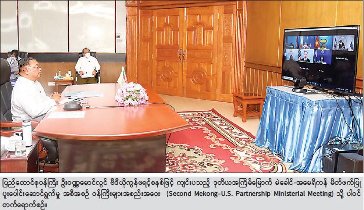 ဆက်လက်၍ ပြည်ထောင်စုဝန်ကြီးက မဲခေါင်-အမေရိကန် မိတ်ဖက်ပြုပူးပေါင်းဆောင်ရွက်မှု အစီအစဉ်၏အခြေခံမူများ ဖြစ်သော အားလုံးသဘောတူညီမှု၊ တန်းတူညီတူရှိမှုနှင့် ပြည်တွင်း ရေး ဝင်ရောက် စွက်ဖက်ခြင်းမရှိမှု စသည့်မူများအပေါ်အခြေခံ၍ အလုံးစုံပါဝင်သော စဉ်ဆက် မပြတ် ဖွံ့ဖြိုးတိုးတက်ရေးကိုရှေးရှုကာ မဲခေါင်ဒေသပြည်သူများ ကို အကူအညီများ ပိုမိုပေး အပ်သွားရန် ထည့်သွင်းပြောကြားသည်။ ထို့ပြင် ပညာရေး၊ လူငယ်၊ စွမ်းအားမြှင့်တင်မှု၊ စွမ်းအင်နှင့် သဘာဝ ပတ်ဝန်းကျင်ထိန်းသိမ်းရေး နယ်ပယ်များတွင် ပူးပေါင်းဆောင်ရွက် သွားမည့် အစီအစဉ်များပါဝင်သည့် မဲခေါင်-အမေရိကန် မိတ်ဖက်ပြု ပူးပေါင်းဆောင်ရွက်မှု၏ “လုပ်ငန်းအစီအစဉ် (၂၀၂၁-၂၀၂၃)” ထုတ်ပြန်ခြင်းကို ကြိုဆိုကြောင်း ပြောကြားသည်။