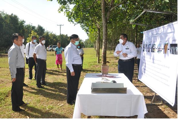 ထို့နောက် ပြည်ထောင်စုဝန်ကြီးသည် ကျိုက်ထိုမြို့နယ်ရှိ အမှတ်(၂၇) ကုန်ကြမ်းဌာန၊ မရမ်းကုန်းရာဘာခြံသို့ရောက်ရှိပြီး စက်မှုကုန်ကြမ်းသီးနှံ ဖြစ်သည့် ရာဘာပင်များကို ဖြစ်ထွန်းအောင်မြင်အောင်နှင့် ရာဘာစေးတိုးတက် ထုတ်လုပ်နိုင်ရေး အတွက်ပင် ပြည့်/ကွက် ပြည့် အစေးခြစ်နိုင်ရေး ကြိုးစားဆောင်ရွက်ရန်၊ စက်မှုလုပ်ငန်းများ ဖွံ့ဖြိုးတိုးတက်မှုတွင် ရာဘာအခြေခံ ထုတ်ကုန်ပစ္စည်းများသည် မရှိမဖြစ် လိုအပ်၍ အလေးထားဆောင်ရွက်ရန်၊ အထွက် နှုန်း နည်းပါးသွားသည့် ပင်အို/ ပင်ဟောင်းများနေရာတွင် အထွက်နှုန်း ကောင်းမွန် သည့် မျိူးကောင်းမျိုးသန့် ရာဘာပင်များဖြင့် နှစ်စဉ်အစားထိုး စိုက်ပျိုးနိုင်ရေး စီမံချက်များ ရေးဆွဲဆောင်ရွက်ရန် မှာကြားသည်။