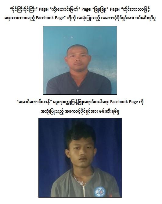 မသမာသူများအနေဖြင့် လူမှုကွန်ရက်ဖြစ်သည့် Facebook တွင် အမည်အမျိုးမျိုးဖြင့် ကိုယ်ပိုင် Page များ ဖွင့်လှစ်အသုံးပြုကာ ငွေစက္ကူ အတုများ ဝယ်ယူရရှိနိုင်ကြောင်း ယုံကြည်အောင်ပြော ဆို၍ ၎င်းတို့နှင့်ဆက်သွယ်လာသူ ငွေစက္ကူ အတုဝယ်ယူလိုသူများထံမှ ငွေကြေးလိမ်လည် ရယူမှုများ ဖြစ်ပွားလျက်ရှိသဖြင့် အဆိုပါ Facebook အကောင့်ပိုင်ရှင်များအား ဖမ်းဆီး ရမိရေးအတွက် အထူး အမှုစစ်အဖွဲ့များ ဖွဲ့စည်း၍ နည်းပညာအကူအညီရယူကာ စုံစမ်းရှာ ဖွေဖော်ထုတ်ခဲ့ရာ လူမှုကွန်ရက် စာမျက်နှာပေါ်တွင် ငွေစက္ကူ အတုအရောင်းအဝယ်ပြုလုပ်ရန် ဖွင့်လှစ်ထားသော Facebook Page များဖြစ်သည့် “Shine Money” ငွေတုရောင်းဝယ်ရေး၊ “ဝိုင်ကြီးပိုင်ကြီး” ၊ “ကျီးကောင်းမြတ်၊ “ခြူးခြူး” “ထိုင်းဘာသာဖြင့်ရေးသားထားသည့် Facebook Page”၊ “အောင်ကောင်းမာန်” ငွေတုစက္ကူဖြန့်ဖြူး ရောင်းဝယ်ရေး၊ “ငွေတုရောင်း ဝယ်ရေး” Facebook Page တို့အား စိစစ်တွေ့ရှိခဲ့ရပါသည်။