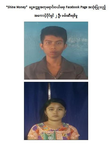 ထိုသို့ စိစစ်တွေ့ရှိရသည့် Facebook Page ပိုင်ရှင်များအား နည်းပညာအကူအညီများဖြင့် ဖော်ထုတ်ဖမ်းဆီးရမိရေးဆောင်ရွက်ခဲ့ရာ "Shine Money" ငွေတုရောင်းဝယ်ရေး Facebook Page အသုံးပြုသည့် အကောင့်ပိုင်ရှင်အား စုံစမ်းဖော်ထုတ်ခဲ့ရာ ဧရာဝတီတိုင်းဒေသကြီး၊ မြန်အောင် မြို့နယ်၊ ကျွဲတဲကုန်းကျေးရွာအုပ်စု ညောင်ဝင်းကျေးရွာနေ ဇွဲဝေဖြိုး(၂၂)နှစ်၊ (ဘ) ဦးကျော်သူရမိုးနှင့် အေးပပ(၁၈)နှစ်၊ (ဘ)ဦးမျိုးညီညီတို့ဖြစ်ကြောင်း ဖော်ထုတ်တွေ့ရှိရသည့် အတွက် မတ်လ ၃ ရက်နေ့ ည ၉ နာရီခွဲအချိန်တွင် ၎င်းတို့၏ နေအိမ်အား ဝင်ရောက်ရှာဖွေရာ ငွေစက္ကူ အတုနှင့် ပတ်သက်၍ ဆက်စပ်ပစ္စည်းများ ရှာဖွေတွေ့ရှိခြင်းမရှိသော်လည်း ငွေစက္ကူ အတုများရရှိမည်ဖြစ်ကြောင်း အခြားသူများ ယုံကြည်အောင်ပြောဆိုကာ ငွေကြေးလိမ်လည် ရယူခဲ့ရာ၌ အသုံးပြုခဲ့သော Facebook Page များဖွင့်လှစ်ထားသည့် လက်ကိုင်ဖုန်း ၃ လုံးတို့ကို သိမ်းဆည်းရမိခဲ့ပါသည်။