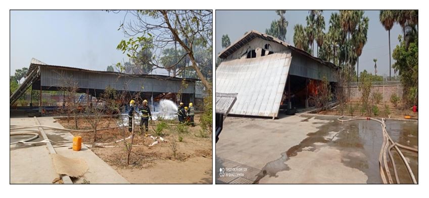 ထိုသို့အကြမ်းဖက်သမားများ၏ မီးရှို့ဖျက်ဆီးခဲ့မှုကြောင့် မီးလောင်မှုဖြစ်ပွားကြောင်း သတင်းအရ လုံခြုံရေးတပ်ဖွဲ့ဝင်များက မီးသတ်တပ်ဖွဲ့ဝင်များနှင့်ပူးပေါင်း၍ မီးသတ်ယာဉ် ၁ စီး၊ ရေသယ်ယာဉ် ၄ စီးတို့ဖြင့် သွားရောက်မီးငြိမ်းသတ်ခဲ့ရာ ညနေ ၅ နာရီ ၄၀ မိနစ်တွင် မီးငြိမ်းသွားခဲ့ပြီး မီးလောင်မှုကြောင့် အဆိုပါအလုပ်ရုံဝင်းအတွင်းရှိ အလျား ၇၀ ပေ၊ အနံ ၂၀ ပေ။ အမြင့် ၁၅ ပေခန့်ရှိ အုတ်ခင်း၊ သွပ်မိုး၊ သံဖရိန်ဖြင့် တည်ဆောက်ထားသည့် ဂိုထောင်တစ်လုံး၊ အဆိုပါဂိုထောင်အတွင်းထားရှိသည့် မက်သနောအနံ့အမွှေးဆီ ပေပါ ၁၅၀ လုံး၊ စုစုပေါင်းတန်ဖိုးငွေ ၄၅,၇၉၀,၀၀၀ ကျပ်ခန့် မီးလောင်ပျက်စီး ဆုံးရှုံးခဲ့ပါသည်။