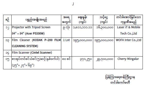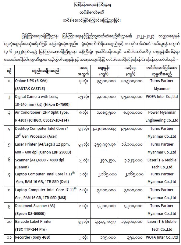 ပြန်ကြားရေးဝန်ကြီးဌာန၊ တင်ဒါကော်မတီ တင်ဒါအောင်မြင်ကြောင်းကြေညာခြင်း 06/07/2022 ပြန်ကြားရေးဝန်ကြီးဌာန၊ တင်ဒါကော်မတီ တင်ဒါအောင်မြင်ကြောင်းကြေညာခြင်း