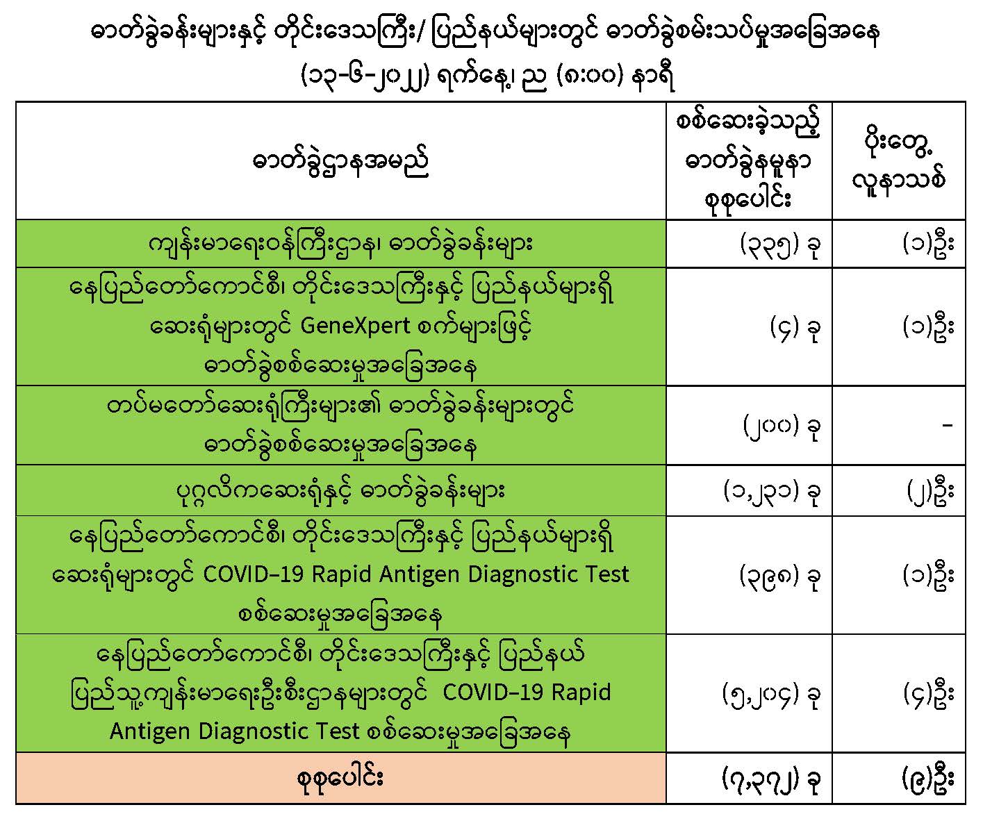 သို့ဖြစ်ပါ၍ ယနေ့အထိဓာတ်ခွဲနမူနာစုစုပေါင်း (၈,၂၈၄,၀၉၈) ခုအားစစ်ဆေးခဲ့ပြီး COVID-19 ဓာတ်ခွဲအတည်ပြုလူနာ စုစုပေါင်း (၆၁၃,၄၅၂) ဦး ရှိပြီ ဖြစ်ပါသည်။