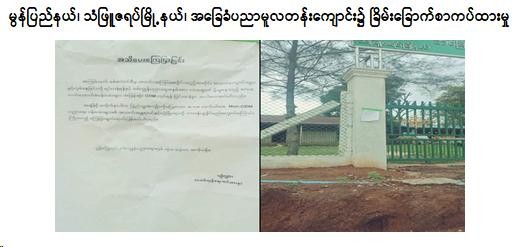 ထိုသို့ဆောင်ရွက်လျက်ရှိရာ ဇွန်လ ၁၂ ရက်နေ့ နံနက် ၆ နာရီ ၄၅ မိနစ်ခန့်တွင် မွန်ပြည်နယ်၊ ရေးမြို့နယ်၊ အောင်သပြေကျေးရွာရှိ တောင်စွန်းအခြေခံပညာအထက်တန်းကျောင်းခွဲ၌ လည်းကောင်း၊ နံနက် ၁၀ နာရီခန့်တွင် ပဲခူးတိုင်းဒေသကြီး၊ ရွှေကျင်မြို့နယ်၊ တံခွန်တိုင်ကျေးရွာရှိ အခြေခံပညာအထက်တန်းကျောင်း၌ လည်းကောင်း၊ ညနေ ၅ နာရီ ၃၀ မိနစ်ခန့်တွင် မွန်ပြည်နယ်၊ သံဖြူဇရပ်မြို့နယ်၊ အေးကမ္ဘာကျေးရွာရှိ အခြေခံပညာမူလတန်းကျောင်းရှေ့၌ လည်းကောင်း၊ ဇွန်လ ၁၃ ရက်နေ့ နံနက် ၇ နာရီခွဲအချိန်တွင် ကရင်ပြည်နယ်၊ ကြာအင်းဆိပ်ကြီးမြို့နယ်၊ ကျိုက်ဒုံ ကျေးရွာရှိ အခြေခံပညာအထက်တန်းကျောင်း၌လည်းကောင်း ကျောင်းတက်ရောက်နေသည့် ဆရာ၊ ဆရာမများနှင့် ကျောင်းသား၊ ကျောင်းသူများအား ကျောင်းတက်ရောက်ခြင်းမပြုရန် ဟန့်တား ထားသည့် ခြိမ်းခြောက်စာများကို PDF အမည်ခံအကြမ်းဖက်သမားများက ခြိမ်းခြောက်ပေးပို့ ထားကြောင်း သိရှိရသည်။
