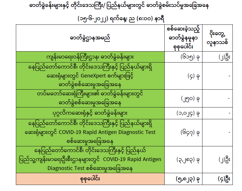 သို့ဖြစ်ပါ၍ ယနေ့အထိ ဓာတ်ခွဲနမူနာစုစုပေါင်း (၈,၂၉၆,၃၃၄) ခုအား စစ်ဆေးခဲ့ပြီး COVID-19 ဓာတ်ခွဲအတည်ပြုလူနာ စုစုပေါင်း (၆၁၃,၄၆၄) ဦး ရှိပြီ ဖြစ်ပါသည်။