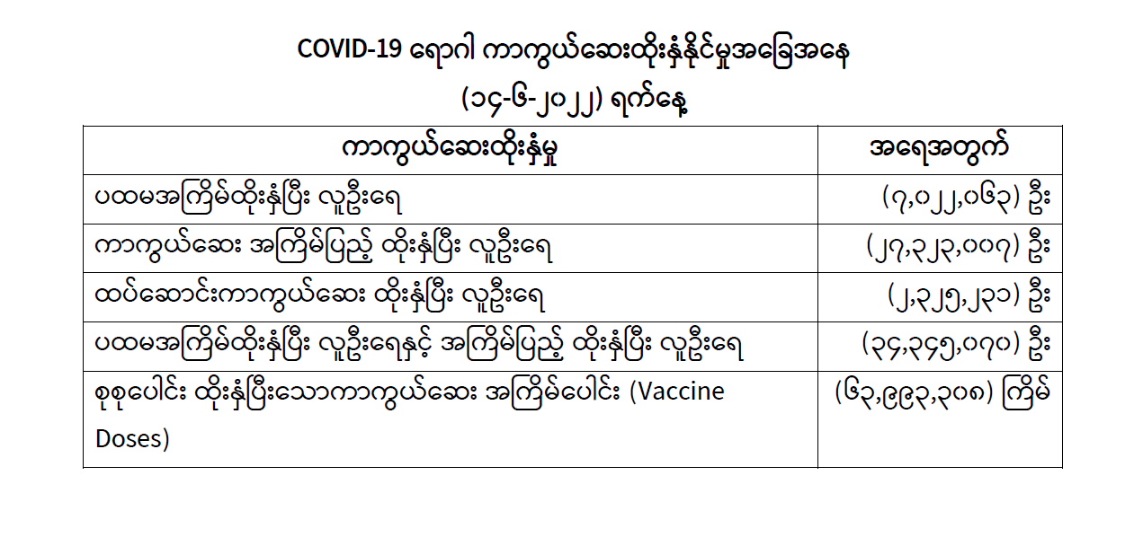 COVID-19 ရောဂါကာကွယ် ထိန်းချုပ်ရေးအတွက် တိုင်းဒေသကြီး/ ပြည်နယ်များတွင် COVID-19 ရောဂါကာကွယ်ဆေးကို ဦးတည်အုပ်စုများသတ်မှတ်၍ ထိုးနှံပေးလျက်ရှိရာ (၁၄-၆-၂၀၂၂) ရက်နေ့အထိ လူဦးရေစုစုပေါင်း (၃၄,၃၄၅,၀၇၀) ဦးအား ထိုးနှံပေးပြီးဖြစ်၍ ပထမအကြိမ် ထိုးနှံပြီးစီးသူ (၇,၀၂၂,၀၆၃) ဦး၊ ကာကွယ်ဆေးအကြိမ်ပြည့် ထိုးနှံပြီးစီးသူ (၂၇,၃၂၃,၀၀၇) ဦးနှင့် ထပ်ဆောင်းကာကွယ်ဆေး ထိုးနှံပြီးစီးသူ (၂,၃၂၅,၂၃၁) ဦး ရှိပြီဖြစ်ပါသည်။ သို့ဖြစ်ပါ၍ (၁၄-၆-၂၀၂၂) ရက်နေ့အထိ မြန်မာနိုင်ငံတွင် COVID-19 ရောဂါကာကွယ်ဆေး အကြိမ်ရေ စုစုပေါင်း (၆၃,၉၉၃,၃၀၈) ကြိမ် ထိုးနှံပြီး ဖြစ်ပါသည်။