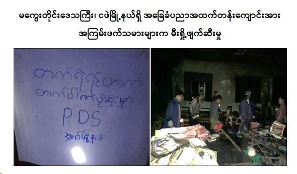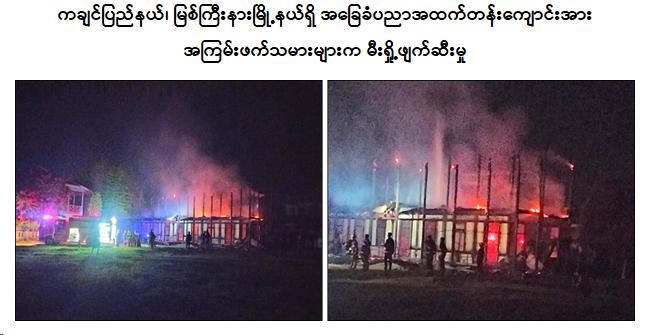 အလားတူ ည ၆ နာရီခန့်တွင် ချင်းပြည်နယ်၊ မတူပီမြို့နယ်၊ လိုင်လင်းပီမြို့၊ အမှတ်(၁) ရပ်ကွက်ရှိ စည်ပင်ရုံးနှင့် အမှတ်(၂)ရပ်ကွက်ရှိ “ခမ်း”ကိုယ်ပိုင်အထက်တန်းကျောင်းတို့အား လည်းကောင်း၊ ည ၁၀ နာရီ ၅၀ မိနစ်ခန့်တွင် ဧရာ၀တီတိုင်းဒေသကြီး၊ လေးမျက်နှာမြို့နယ်၊ အချုပ်ကလေးကျေးရွာရှိ အခြေခံပညာ အလယ်တန်းကျောင်းခွဲအား လည်းကောင်း၊ ယနေ့ နံနက် ၂ နာရီခန့်တွင် မကွေးတိုင်းဒေသကြီး၊ ငဖဲမြို့နယ်၊ ဂုတ်ကြီးကျေးရွာရှိ အခြေခံပညာ အထက်တန်းကျောင်းအား လည်းကောင်း၊ နံနက် ၃ နာရီ ၁၀ မိနစ်ခန့်တွင် ကချင်ပြည်နယ်၊ မြစ်ကြီးနားမြို့နယ်၊ မန်ခိန်ရပ်ကွက်၊ အခြေခံပညာ အထက်တန်းကျောင်းရှိ “ရွှေနဒီ” ကျောင်းဆောင်ဟောင်းအား လည်းကောင်း PDF အမည်ခံ အကြမ်းဖက်သမားများက မီးပုလင်းများဖြင့် ပစ်ပေါက်ခြင်း၊ မီးရှို့ဖျက်ဆီးခြင်း စသည့် အကြမ်းဖက်လုပ်ရပ်များကို လုပ်ဆောင်ကြရာ မီးလောင်မှုများကြောင့် လုံခြုံရေးတပ်ဖွဲ့ဝင်များ၊ မီးသတ်တပ်ဖွဲ့ဝင်များနှင့် ဒေသခံပြည်သူများက ဝိုင်းဝန်းငြှိမ်းသတ်ခဲ့ရသည်။ မီးလောင်မှုများကြောင့် ကျောင်းဆောင်များအတွင်းရှိ စာရွက်စာတမ်း၊ စာရေးခုံများ၊ သင်ထောက်ကူပစ္စည်းများနှင့် ဗီရိုများ မီးလောင်ပျက်စီးဆုံးရှုံးခဲ့ပြီး အုတ်ခံ၊ ပျဉ်ထောင်၊ သွပ်မိုး၊ ပျဉ်ခင်း၊ စာသင်ခန်း (၃)ခန်းတွဲ (၂)ထပ် ကျောင်းဆောင် ၁ လုံး မီးလောင်ပျက်စီး ဆုံးရှုံးခဲ့ကြောင်း သိရသည်။