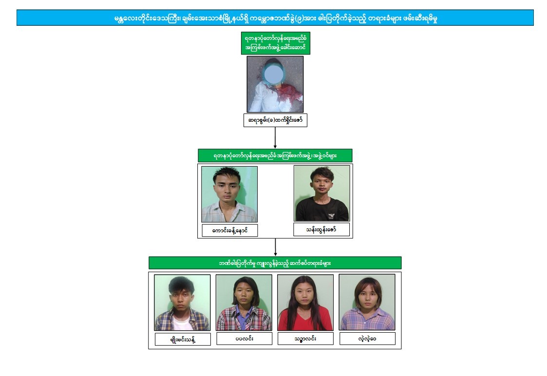 အဆိုပါ ဖြစ်စဉ်နှင့်ပတ်သက်၍ တရားခံများအား အမြန်ဆုံး ဖမ်းဆီးရမိရေး ဆောင်ရွက်ခဲ့ရာ ၂၀၂၂ ခုနှစ်၊ ဇွန်လ ၂၂ ရက်တွင် ညောင်ဦးမြို့၊ သာယာဝတီရပ်၊ အမှတ်(၁)ရပ်ကွက်၌ ဘဏ်ဓါးပြတိုက်မှု ကျူးလွန်ခဲ့သည့် ကောင်းခန့်နောင်၊ သန်းထွန်းဇော်၊ မျိုးမင်းသန့်၊ ပပလင်း၊ သဉ္ဇာလင်းနှင့် လဲ့လဲ့ဝေတို့ ၆ ဦးအား ဖမ်းဆီးရမိခဲ့သည်။
