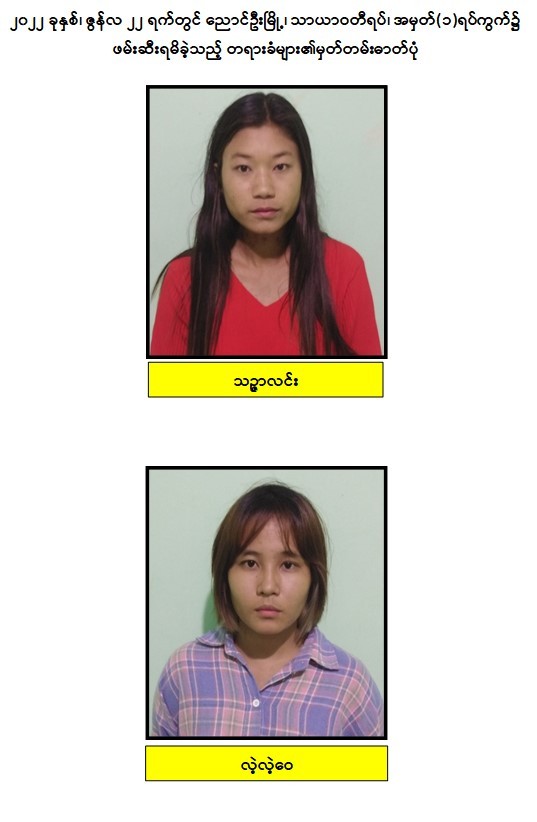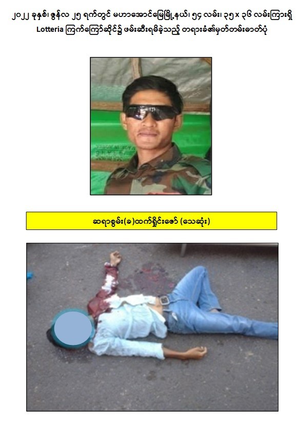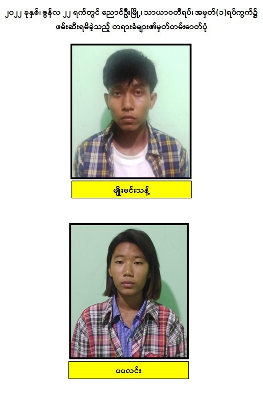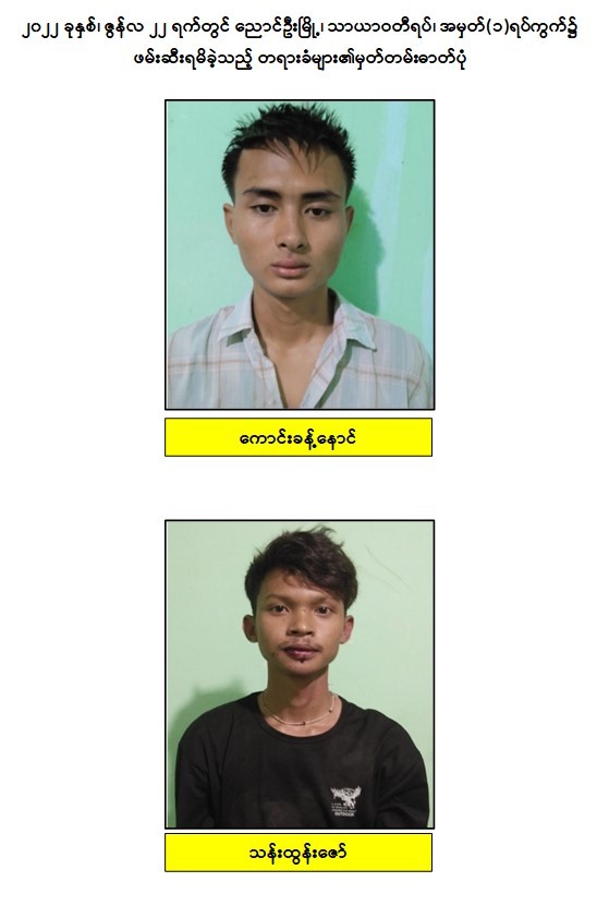 သို့ဖြစ်ပါ၍ ဖမ်းဆီးရမိ တရားခံများအား ဥပဒေအရ ထိရောက်စွာ အရေးယူနိုင်ရေး ဆက်လက်ဆောင်ရွက်သွားမည်ဖြစ်ပြီး အကြမ်းဖက်မှု ဆောင်ရွက်နေသူများအား ပြည်သူတစ်ရပ်လုံးက ဝိုင်းဝန်းကာကွယ်တိုက်ဖျက်ကြရန်နှင့် ပြစ်မှုကျူးလွန်ရာတွင် ပါဝင်ပတ်သက်သူများ၊ နောက်ကွယ်မှ ထောက်ပံ့ပေးလျက်ရှိသော ဆက်စပ် တရားခံများအား အမြန်ဆုံး ဖမ်းဆီးရမိရေးအတွက် ၎င်းတို့ ပုန်းခိုရာနေရာများ၊ လှုပ်ရှားသွားလာ နေထိုင်မှုသတင်းများ ရရှိပါက သက်ဆိုင်ရာသို့ လျှို့ဝှက်စွာ သတင်းပေး တိုင်ကြားနိုင်ပါကြောင်း၊ သတင်းပေးသူနှင့် ဖမ်းဆီးပေးသူများအား ထိုက်တန်စွာ လျှို့ဝှက်၍ဆုငွေများ ပေးအပ် ချီးမြှင့်လျက်ရှိကြောင်းနှင့် မြို့ရွာများ အမြန်ဆုံး အေးချမ်းတည်ငြိမ်ရေးအတွက် ပြည်သူတစ်ရပ်လုံး ပူးပေါင်းပါဝင် ကြိုးပမ်း ဆောင်ရွက်နိုင်ပါရန် မေတ္တာရပ်ခံအပ်ပါကြောင်း အသိပေး သတင်းထုတ်ပြန်အပ် ပါသည်။