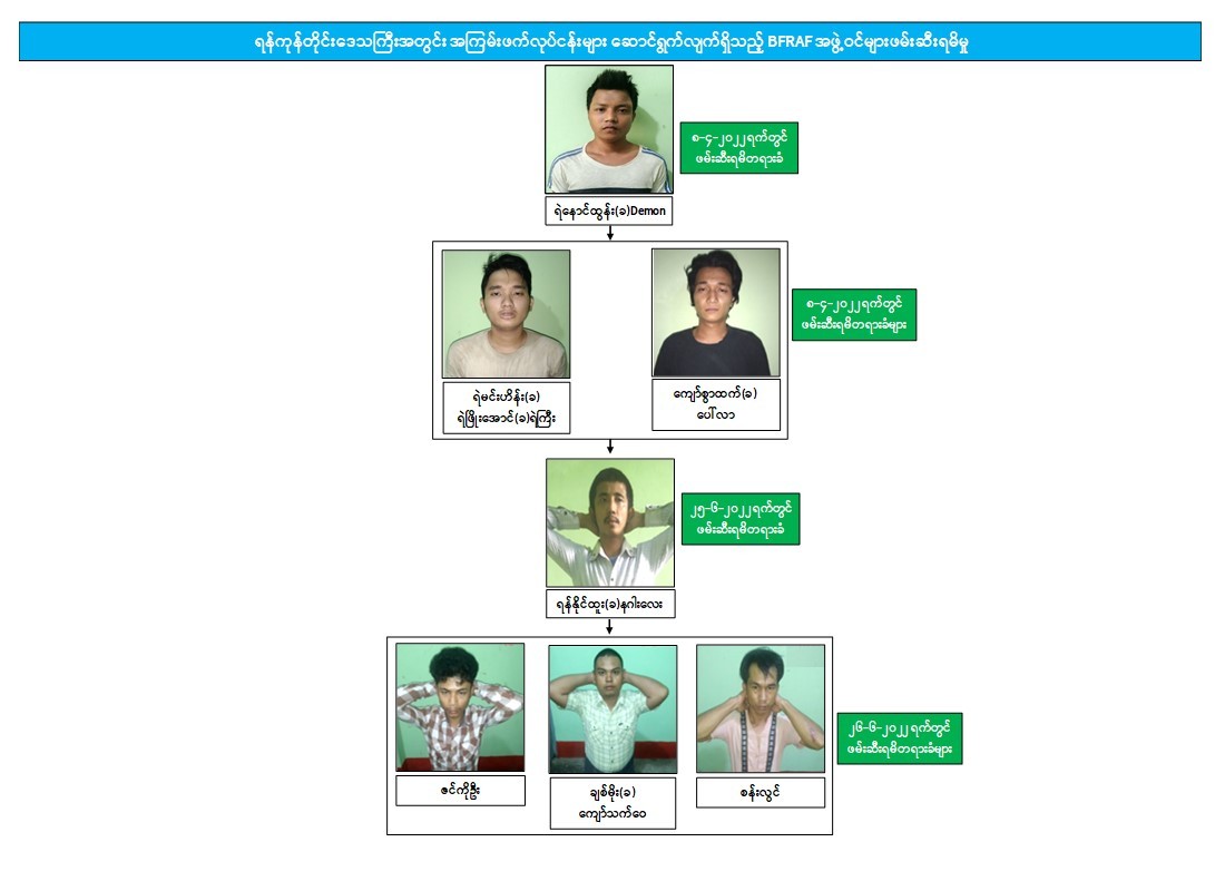 ဖမ်းဆီးရမိတရားခံ ရဲနောင်ထွန်း(ခ) Demon ၏ ထွက်ဆိုချက်အရ ဇွန်လ ၂၅ ရက်တွင် ထန်းတပင်မြို့နယ်၊ တူးချောင်းကျေးရွာအုပ်စု၊ ရေတလိကျေးရွာ၌ BFRAF အမည်ခံ အကြမ်းဖက်အဖွဲ့ဝင် ရန်နိုင်ထူး(ခ)နဂါးလေးအား ဖမ်းဆီးရမိခဲ့ပြီး တရားခံ ရန်နိုင်ထူး(ခ)နဂါးလေး၏ ထွက်ဆိုချက်အရ ဇွန်လ ၂၆ ရက် နံနက်ပိုင်းတွင် ရန်ကုန်တိုင်း ဒေသကြီး၊ လှိုင်သာယာမြို့နယ်၊ အမှတ်(၅)ရပ်ကွက်၊ ရတနာအဆောင်(၂)တွင် ဇင်ကိုဦး၊ ချစ်မိုး(ခ)ကျော်သက်ဝေ၊ စန်းလွင်တို့ ၃ ဦးအား ထပ်မံ ဖမ်းဆီးရမိခဲ့သည်။