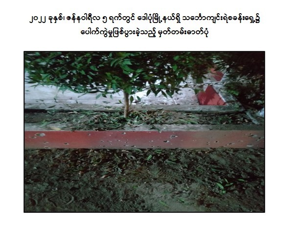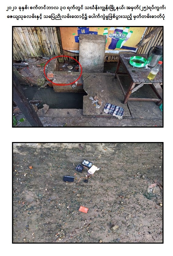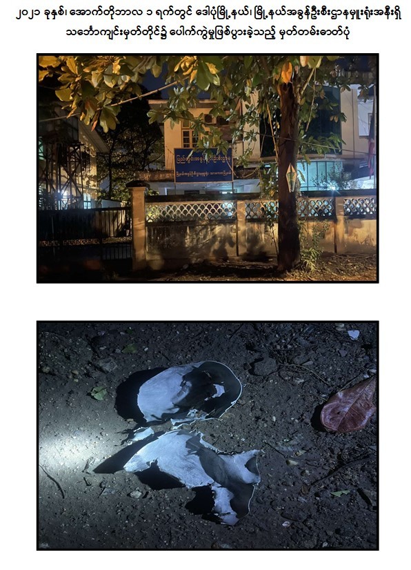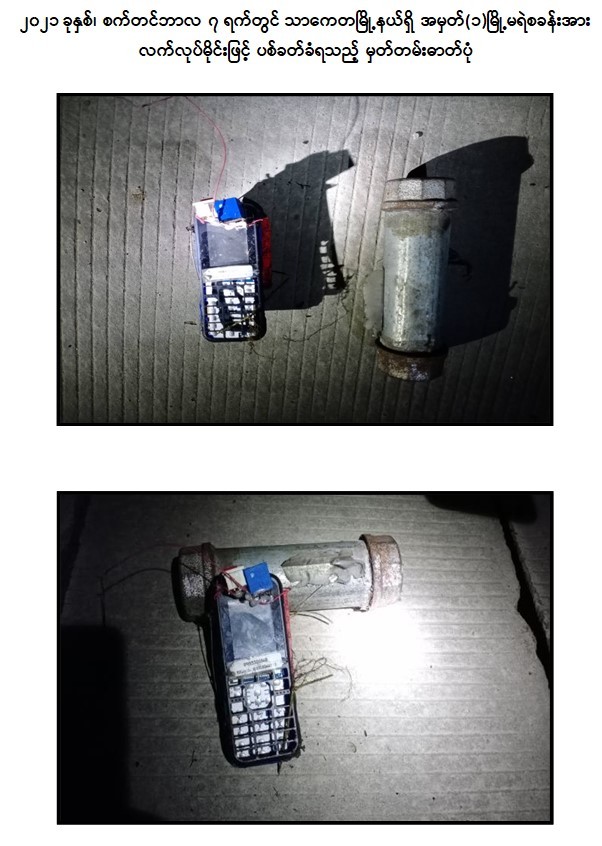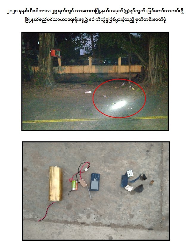 - အောက်တိုဘာလ ၁ ရက်တွင် ရန်ကုန်တိုင်းဒေသကြီး၊ ဒေါပုံမြို့နယ်၊ မြို့နယ်အခွန် ဦးစီးဌာနမှူးရုံး အနီးရှိ သင်္ဘောကျင်း မှတ်တိုင်၌ လက်လုပ်မိုင်း ၁ လုံး ဖောက်ခွဲခဲ့ကြောင်း။