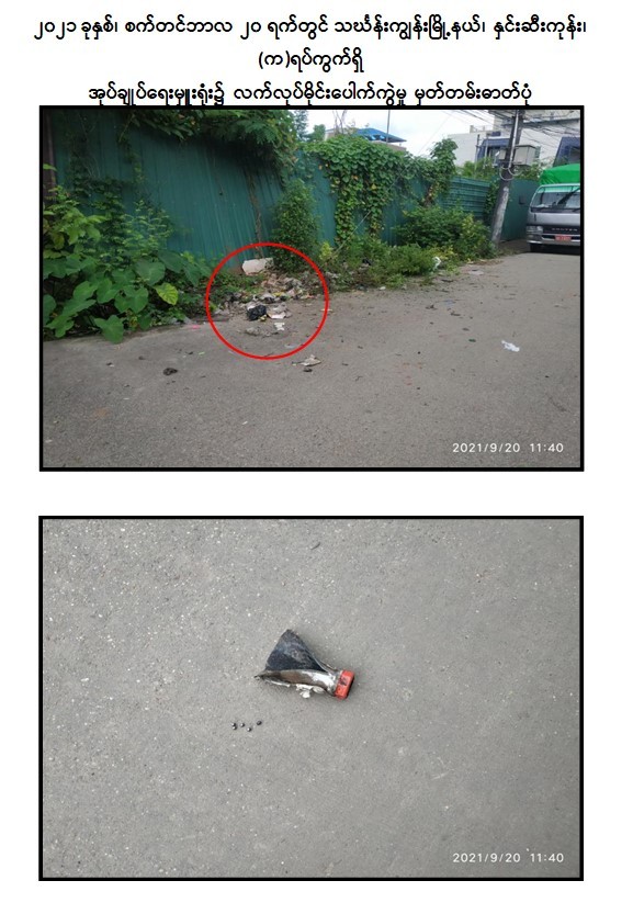 - စက်တင်ဘာလ ၃၀ ရက်တွင် ရန်ကုန်တိုင်းဒေသကြီး၊ သင်္ဃန်းကျွန်းမြို့နယ်၊ အမှတ် (၂၅)ရပ်ကွက်၊ ဇေယျသုခလမ်းနှင့် သပြေညို လမ်းထောင့်၌ လက်လုပ်မိုင်း ၁ လုံး ဖောက်ခွဲခဲ့ကြောင်း။