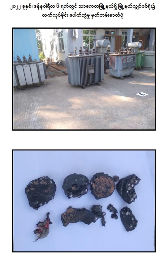 - ဇန်နဝါရီလ ၆ ရက်တွင် ရန်ကုန်တိုင်းဒေသကြီး၊ သာကေတမြို့နယ်ရှိ မြို့နယ်လျှပ်စစ်ရုံးအား လက်လုပ်မိုင်း ၁ လုံး ပစ်ခတ်ဖောက်ခွဲခဲ့ကြောင်း။
