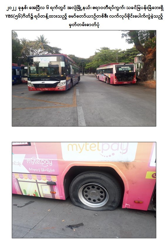 - ဧပြီလ ၆ ရက်တွင် အလုံမြို့နယ်၊ ဧရာဝတီရပ်ကွက်၊ သခင်မြပန်းခြံဘေးရှိ YBS (၅၆)ဂိတ်၌ ရပ်တန့်ထားသည့် မော်တော်ယာဉ် တစ်စီးအား လက်လုပ်မိုင်းဖြင့် ပစ်ခတ်ဖောက်ခွဲခဲ့ကြောင်း။